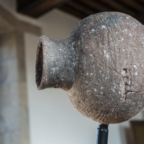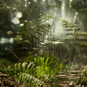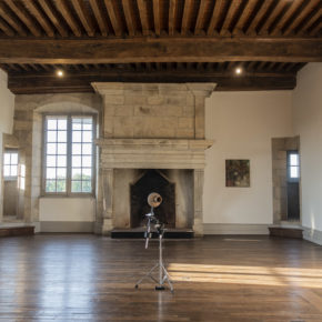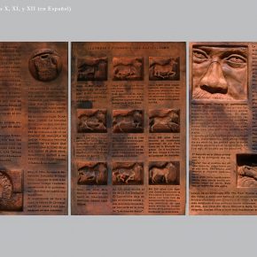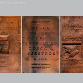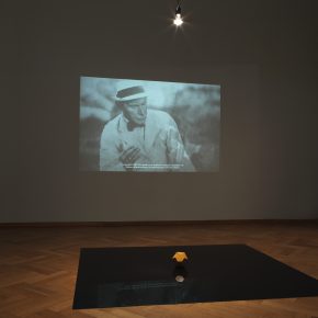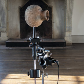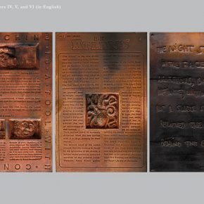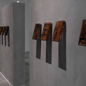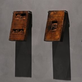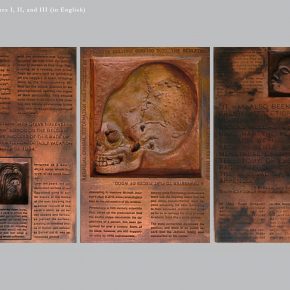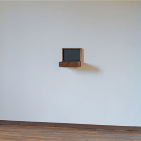 Three wooden pedestals, perspex, two inkjet prints, and a stolen piece of paper