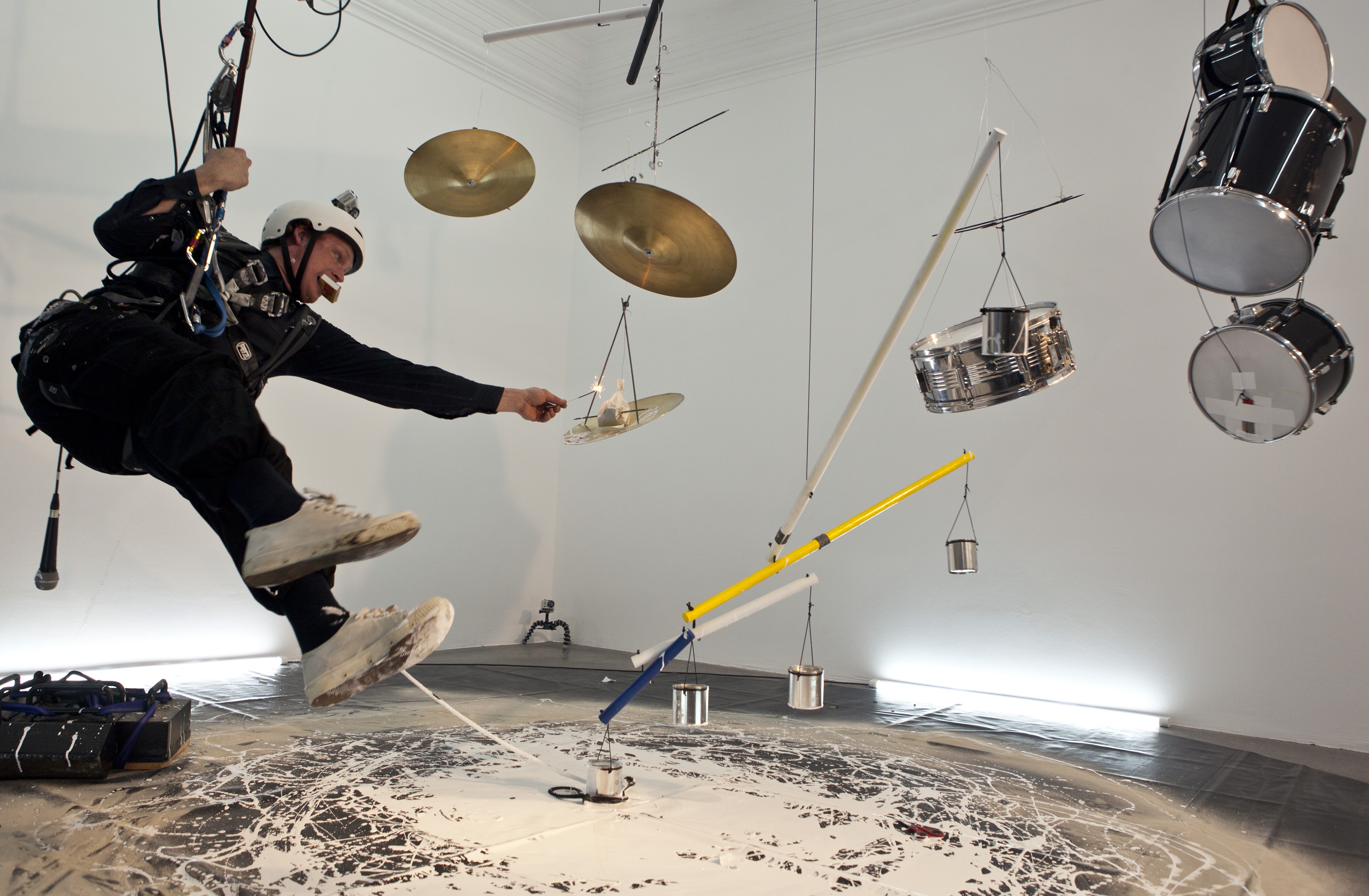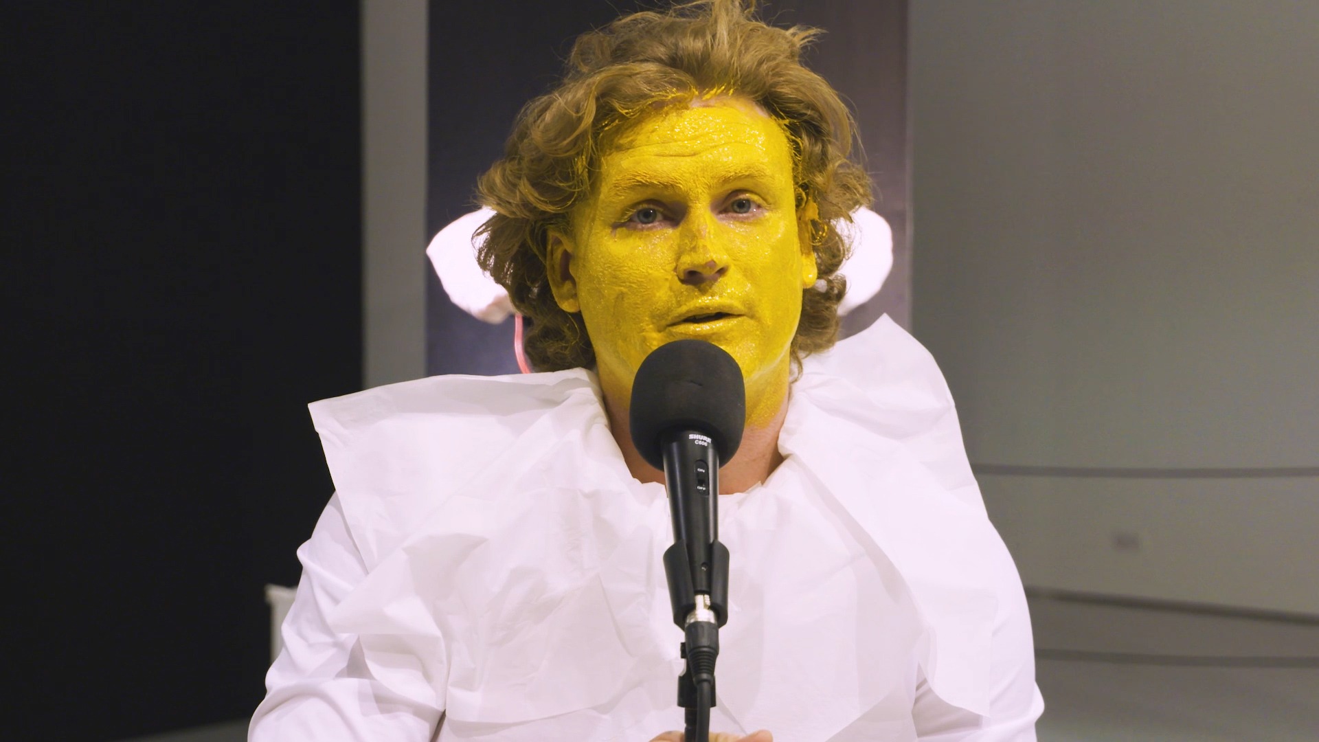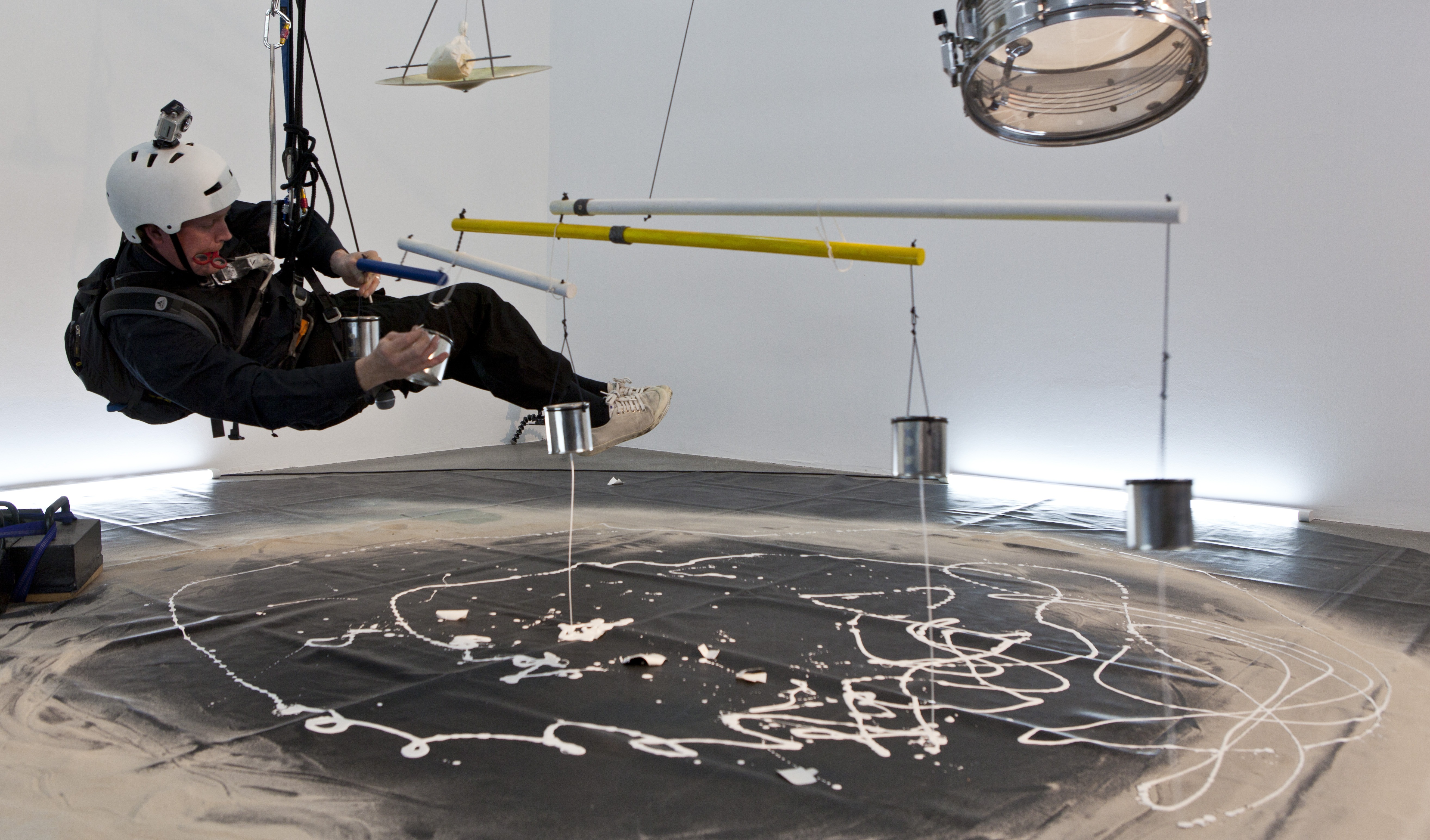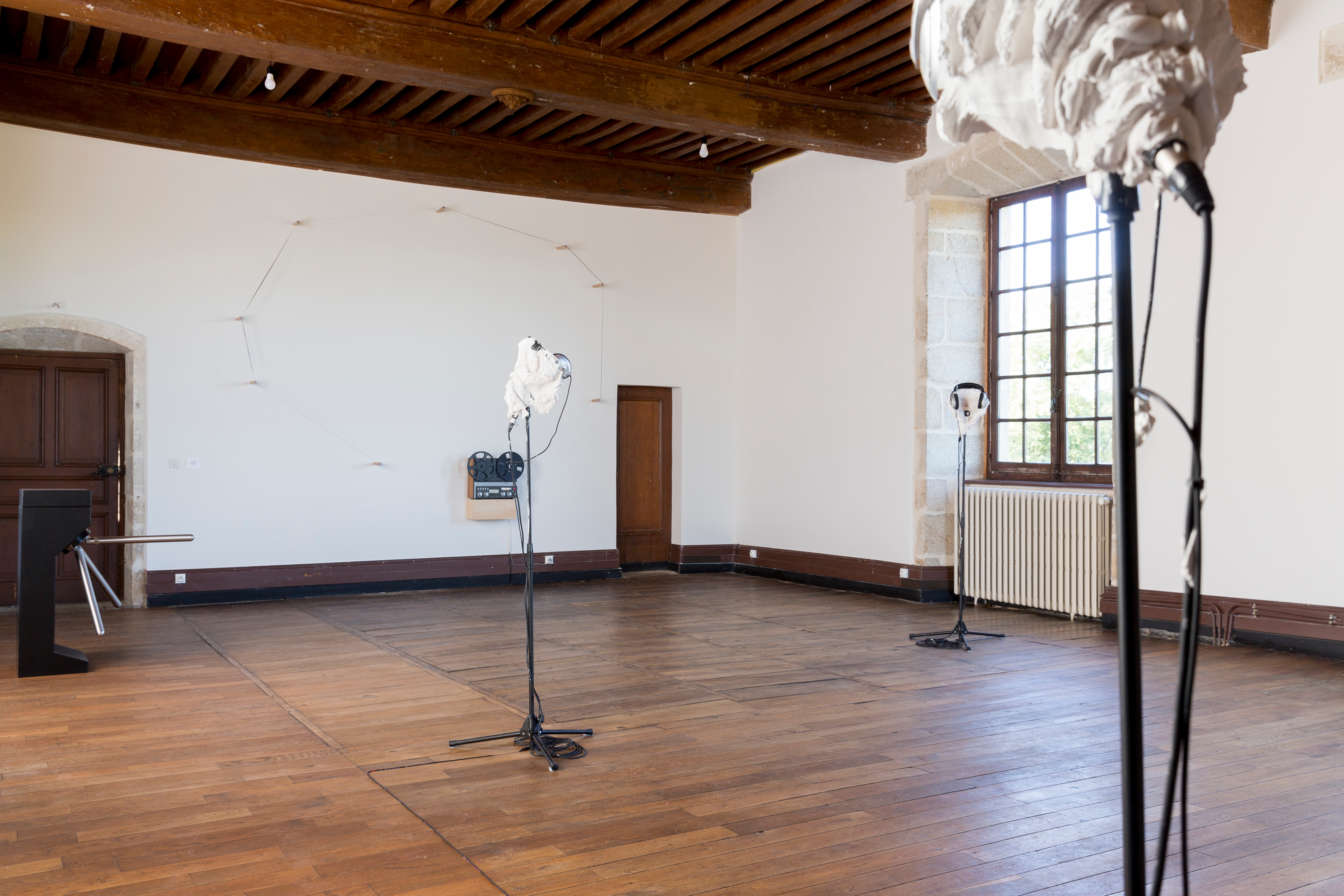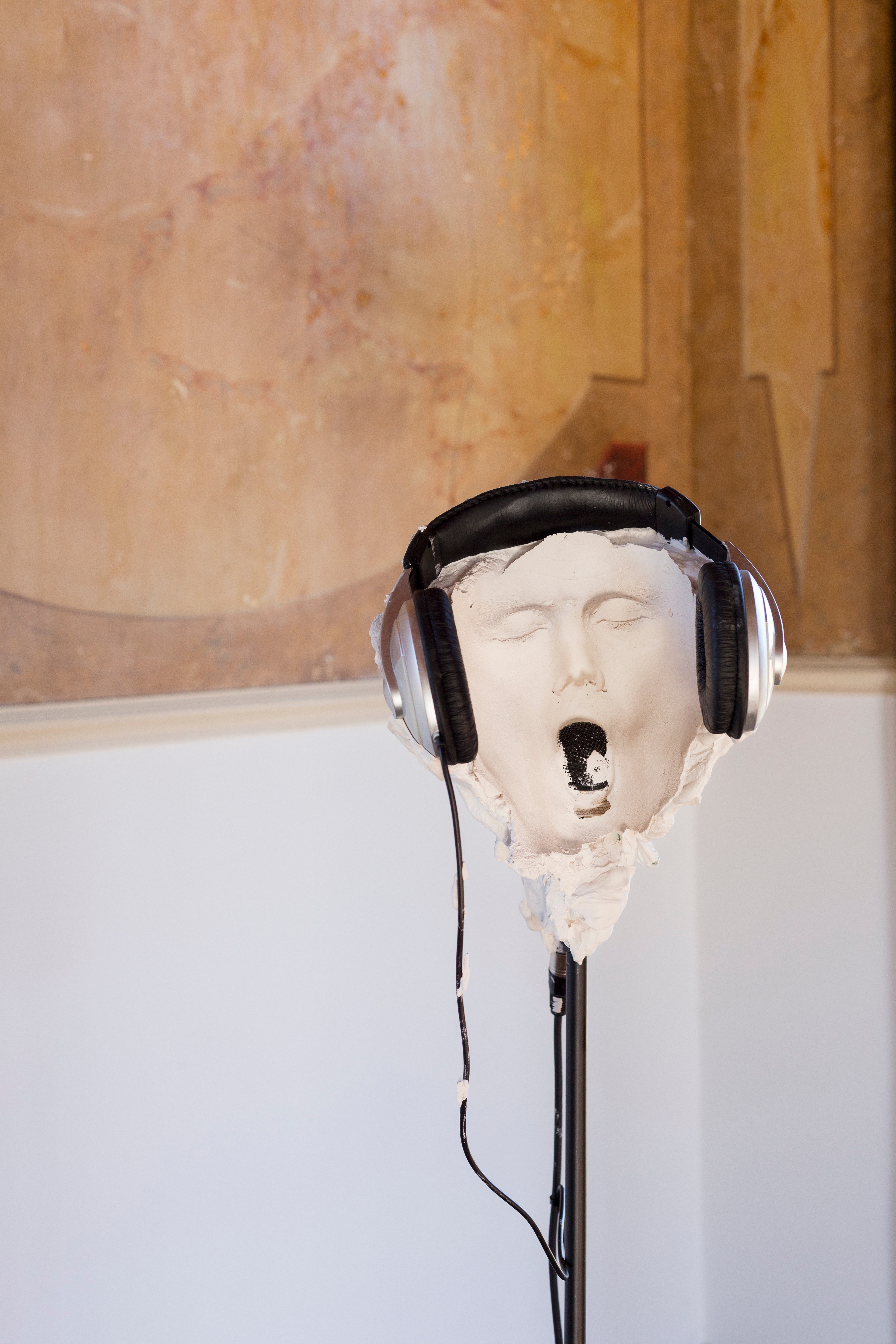 Plaster, microphones, 4 headphones, 4 microphone stands, real to real tape player, tape loop